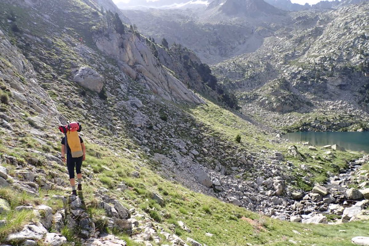 Sense cap mena de problema baixarem per la llera esquerra de la rasa de las Fuens d’Alba per trobar un sender amb marques del GR-T 46 que prendrem a l’esquerra i que en una baixada suau ens durà de nou al Balneario de los Baños de Benasque.